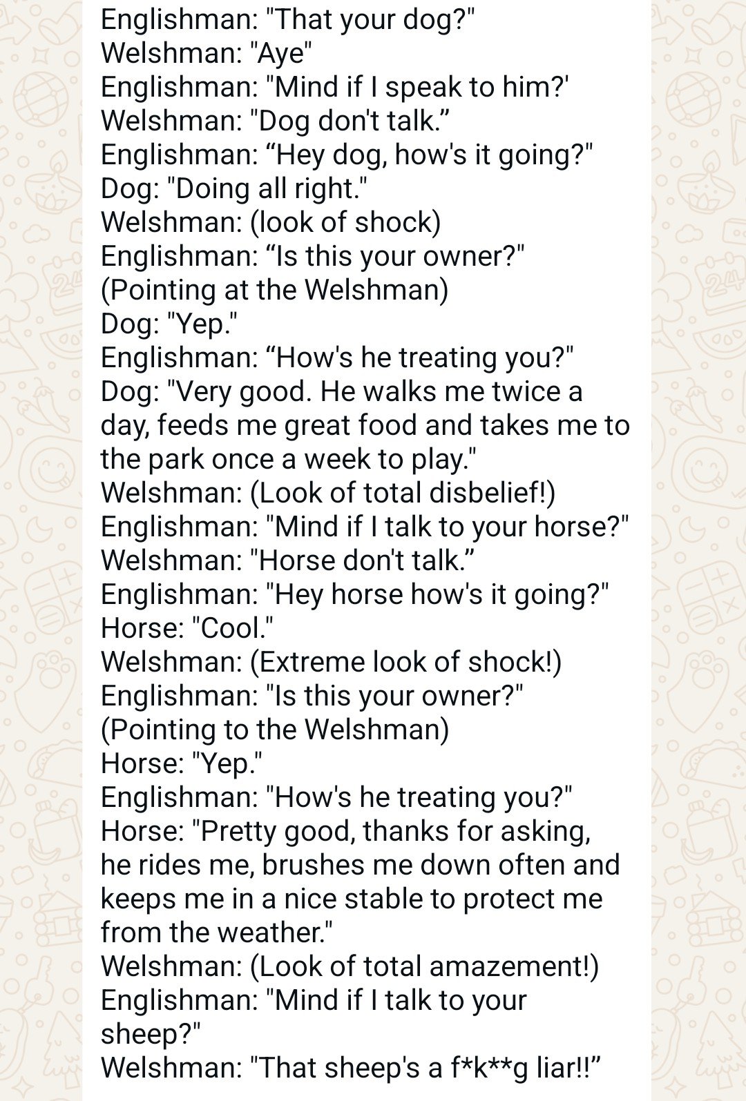 superjack Posted December 9, 2025 Posted December 9, 2025 (edited) I walked into the pub at the weekend and noticed slices of beef tied to the ceiling. I asked the barman "what are they for?" He replied "if you can jump up, grab 1 and pull it off the ceiling, you'll get free beer all night. However, if you don't succeed, you have to pay me £100. So, do you want a go?" I thought for a minute and replied "I would, but the stakes are too high"!!!!!!! Edited December 9, 2025 by superjack