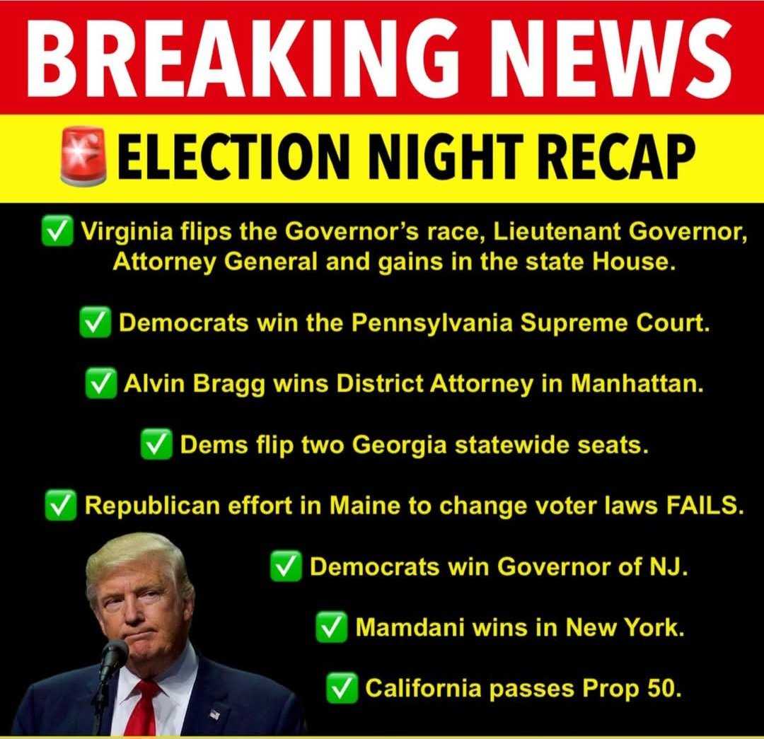 El Prez Posted November 5 Posted November 5 4 hours ago, Watt-Zeefuik said: Election results are in and they're for once quite encouraging. Absolutely thumping win for Mamdani in NYC, a rebuke of Schumer (who never endorsed him), getting over 50% in a three-way race where he was seen as a distant outsider at the start. Sherril and Spanberger both won by huge margins in New Jersey and Virginia, respectively. Critical Pennsylvania court race was won by the liberal incumbants with over 63%, an almost unheard of landslide where the court was quite conservative until very recently. I really want to see what happens in the Virginia legislature. A shift of several seats in both houses towards the Democrats (which would inherently mean Trump-voting districts went Democratic) would be the strongest signal yet of deep anger at Republicans showing up at the ballot box not just in phone polls.