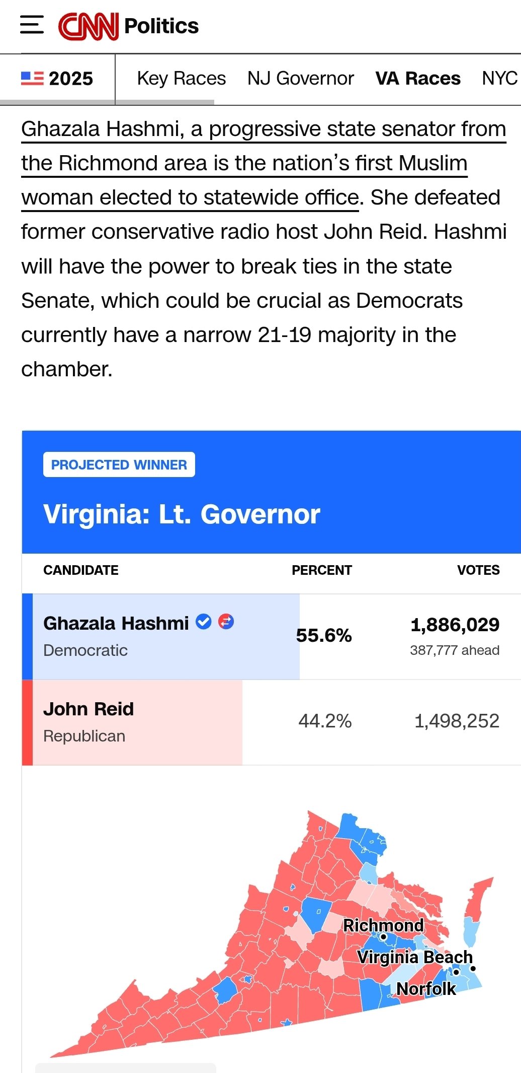 Watt-Zeefuik Posted November 5 Posted November 5 6 hours ago, El Prez said: VA legislative results are in and they are astounding. I was pretty sure Spanberger was going to win (for the worst reasons, unfortunately, her opponent was a Black woman and racism in Virginia, like most of the US, is still very real and active.) In the legislature, though, I was expecting but not at all certain of the Dems keeping control. I was expecting a small gain of like 3-4 seats. I was very fearful of a loss. I was hopeful for a moderately larger gain, maybe as many as 7-8. Currently the Dems are on track to pick up 13 or 14 seats, depending on whom you ask. The VA GOP, just four years ago supposedly the model of taking Trumpism without Trump local, just got annihilated at the state level. Over to outgoing VA Governor Glen Younkin (R) who's clearly in touch with reality. Good data blog here: Jamelle Bouie (a native and proud Virginian) on last night: (the gift link is actually in the next post if you want to read the full article)