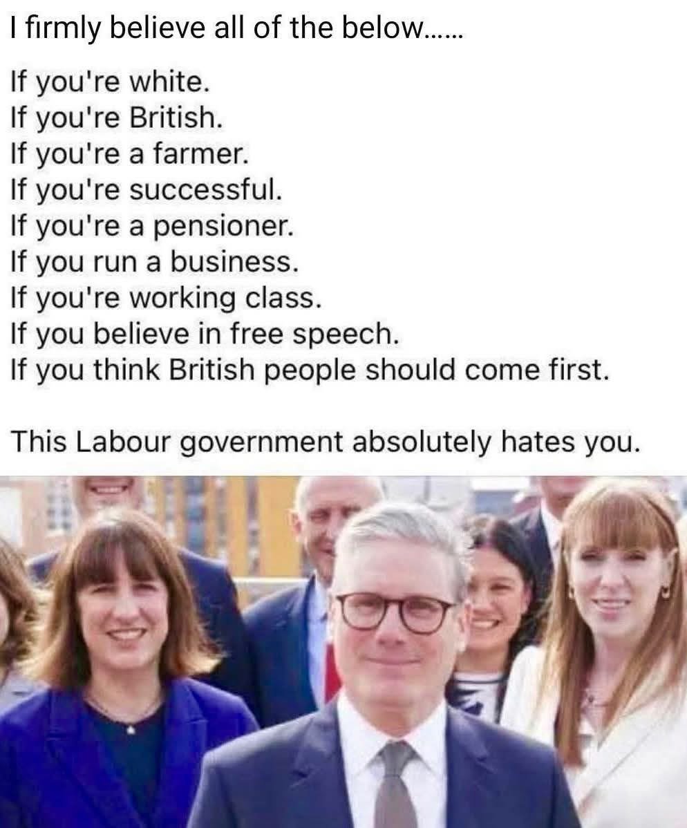 Cade Posted January 13 Posted January 13 The landslide election result seems to have sent some of our posters into a total tailspin. Some astonishingly hilarious claims being made about Starmer's government. He may be largely anonymous and his government may be doing feck all about anything but that's about it. They're useless and directionless, not exactly plotting the downfall of Western civilization.