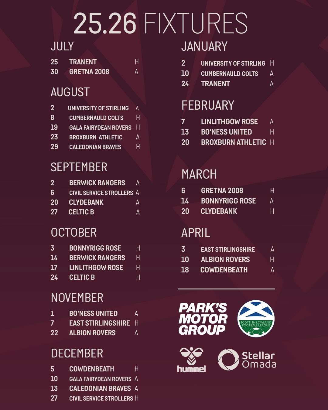 Chuck Berry Posted June 30 Author Posted June 30 Upcoming B team friendlies - all away from home; 1st July: Musselburgh Athletic 2nd July: Stoneyburn 5th July: Blackburn United 5th July: Penicuik Athletic (possibly U19??) 8th July: Spartans 11th July: Burnley U19s 19th July: Dunbar United 26th July: opening Lowland League fixture The Lowland League fixtures will be released at 9.00am tomorrow.