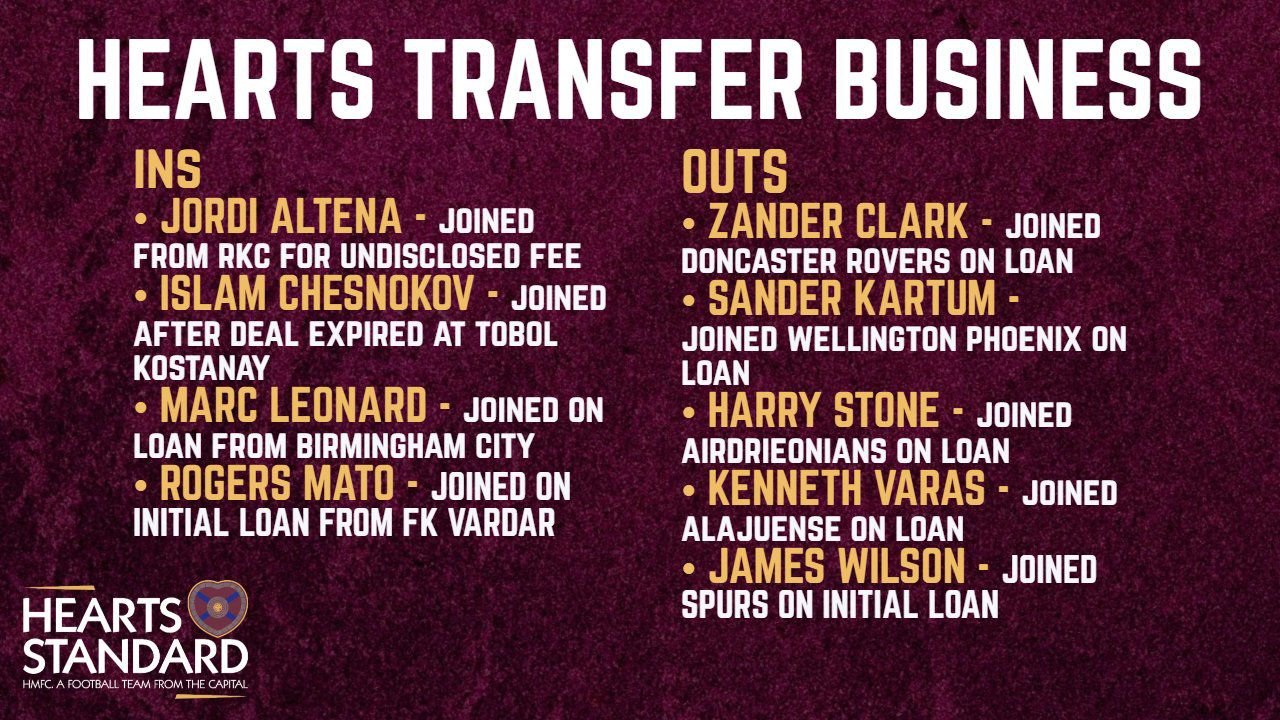 BigStein Posted February 2 Posted February 2 13 minutes ago, BigStein said: Close of play Hearts squad for the rest of the season: Schwolow Gordon Fulton Halkett Findlay Kent McCart Steinwender Altena Borchgrevink Milne Kingsley Leonard Devlin Baningime McEntee Magnusson Ageu Spittal Nieuwenhof Kyziridis Chesnokov Kerjota Mato Forrest Shankland Braga Kabore Kabangu Pollock Non-injured squad for February: Schwolow Gordon Fulton Halkett Findlay Kent McCart Steinwender Altena Milne Leonard Baningime McEntee Magnusson Ageu Spittal Kyziridis Chesnokov Kerjota Mato Forrest Braga Kabore Kabangu