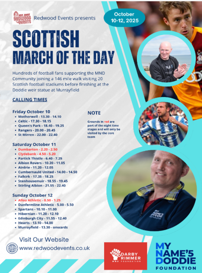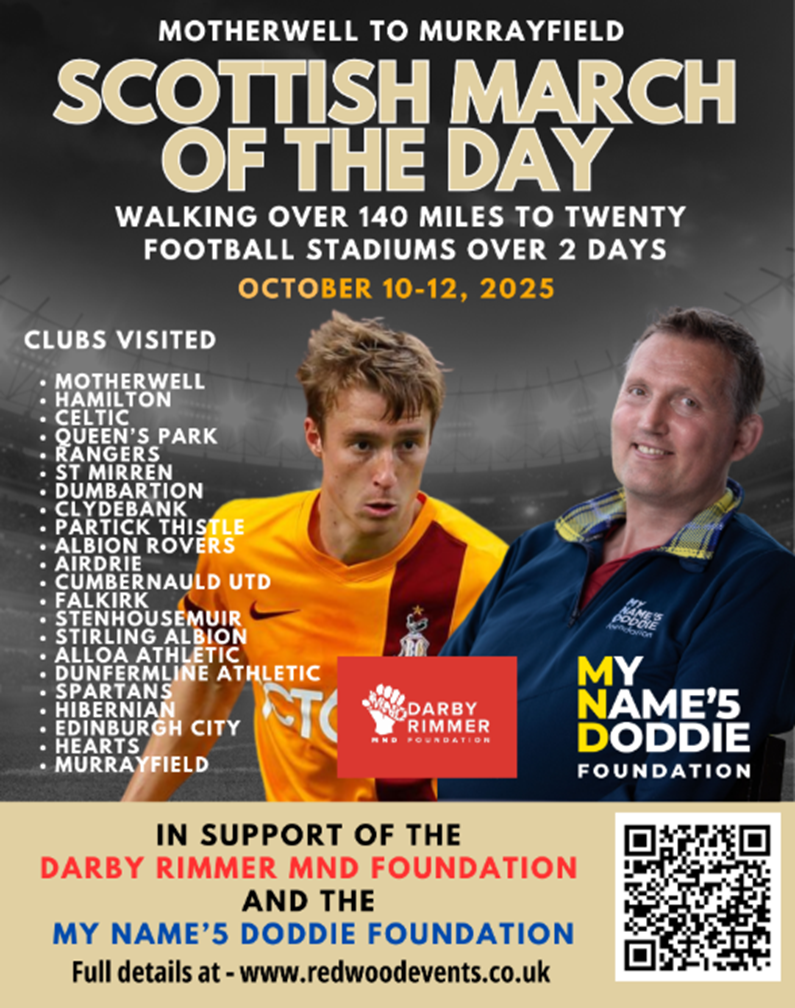 maroonsgotop Posted September 7 Posted September 7 (edited) Following the passing of our 2012 Cup winning Captain, Marius Žaliūkas, most of us are aware how cruel MND is as an illness. One of the guys I play Walking Football with has told me about a MND, Charity Fundraiser that is taking place over the weekend of 10 to 12 October 2025. This is in relation to another young professional footballer (Stephen Darby) who has also been struck down with this dreaded illness. A sponsored walk will visit 22 Football grounds in Scotland, including Hearts, over 3 days and it would be great if we could help raise funds and possibly turn out in numbers to support this special event. I’m not sure if there’s still time to register to take part as one of the 'Open walkers' but I’m sure all walkers who want to go along will be made welcome. (please note I am only raising awareness and not part of the organised group putting this together so any questions will need to be directed through the various organising web sites - details below) This is a summary of the details, as known to me. · Stephen Darby, personal statement. · Event details · How to donate Stephen Darby - Football Career "After playing professional football since the age of 17, on the 12th September 2018, I was forced to retire at the age of 29 after being given the diagnosis of motor neurone disease (MND). At the time of my diagnosis, I was still playing football at Bolton Wanderers and training every day. I had played professional football since the age of 17 having played for Liverpool, Swindon Town, Notts County, Rochdale, Bradford City and Bolton Wanderers. My first sign of symptoms was a weakness in my hand and twitching in my arm. For 12 months I was being treated for something different at one point and things were looking quite promising. However, after 18 months of testing I was finally given the devastating news that I had MND. Testing consisted of MRI scans, EMG tests and nerve conduction study tests. Testing also consisted of having IV infusions lasting 5 days each time and a lumbar puncture. Over the course of the last 2 and a half years, symptoms have been progressing slowly. I have weakness in both hands and twitching in my arms, legs, chest and tongue. Starting the foundation was a way of turning something so devastating into something positive. To have a positive impact on MND and to help those individuals and families living through it to support them." Stephen is married to former England Women’s Captain, Steph Houghton. SCOTTISH MARCH OF THE DAY - 10 to 12 October 2025 The Darby Rimmer MND Foundation and the My Name5 Doddie Foundation are proud to share that they are working together to stage the Scottish March of the Day, a continuous 146-mile fundraising walk around 22 football grounds in Scotland. Each Foundation will have a core team of 12 completing the full route in rotation. This will include many former footballers and those whose lives have been impacted by Motor Neurone Disease. The walk, which starts at Motherwell FC and finishes at the Doddie Weir statue at Murrayfield, will take just over two days to complete. All funds raised will be shared equally by the two charities. This is an open event and anyone can take part. Walkers can register in groups of up to 6 people to walk any of the daytime stages. We are also looking for companies who might want to come on board as an event sponsor, either as one of our two main sponsors, sponsors of one of our 22 stages, or sponsors of one of our 31 core team members. Open Walkers will be able to register in teams of up to six to join any part of the day time stages. These stages include Registration for core walkers costs £10 per person, which covers the cost of their event t-shirts. Registration can be completed online. Full details of how to register or to become a sponsor can be found at the link below. https://www.redwoodevents.co.uk/smotd/ We have only just started to recruit the core teams, and already we have many former footballing heroes signed up to take part, including former Scotland strikers John McGinlay and Andy Walker and former Hibs midfielder Filipe Morais. We are working with Martin Johnston, formerly of Cove Rangers, Brechin City, Peterhead and Elgin City, who has MND. Many of his former teammates and friends are looking to take part, including Kevin Tindal, Barry Thompson, James Lennox and Mark Perry. We are expecting the numbers of former players to grow significantly, including others from the rugby union world too. Come and be part of something very special. Help us bang the drum against Motor Neurone Disease. Donation payment methods Edited September 7 by maroonsgotop double entry