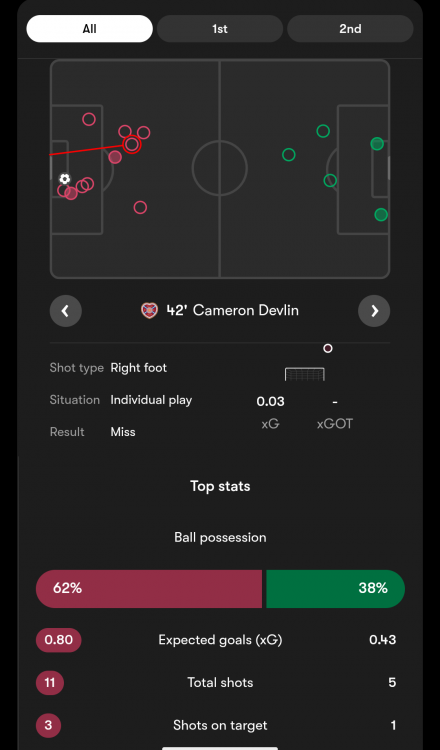 jock _turd Posted October 7 Posted October 7 (edited) 28 minutes ago, Juho_Makela_Goal_Machine said: The stats said we had a 39% chance of winning the game, based on the chances both teams created. So no, the stats didn’t say we won the game easily. I don't think you have looked at the stats or you are at it. Two times as many shots Three times as many shots on target Three times as many shots inside the opponents box Three times as many successful passes in the final third 61% overall possession... I could go on but reading those stats without seeing the game most football people would say they won that game easily. My point is we did not win it easily and that shows how a set of data can easily be mis read. There is on stat where they excelled backward passes Hearts 69 Hibs HOoooooooooooF only 44 Edited October 7 by jock _turd