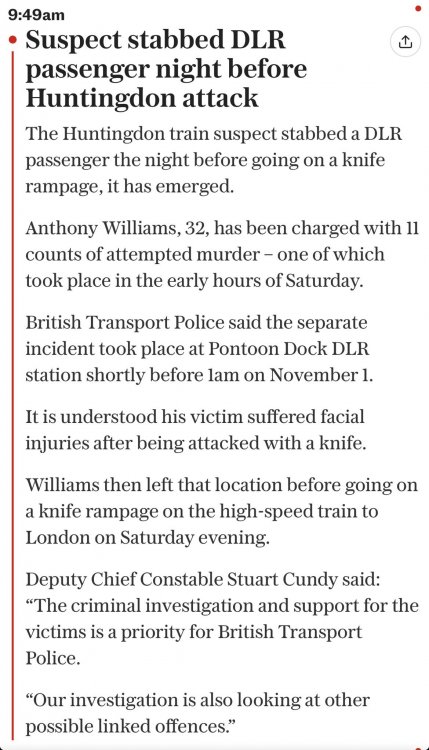 Cameronstheman Posted November 1 Posted November 1 Multiple people stabbed on train in Cambridgeshire as Starmer calls incident 'deeply concerning' - latest - BBC News