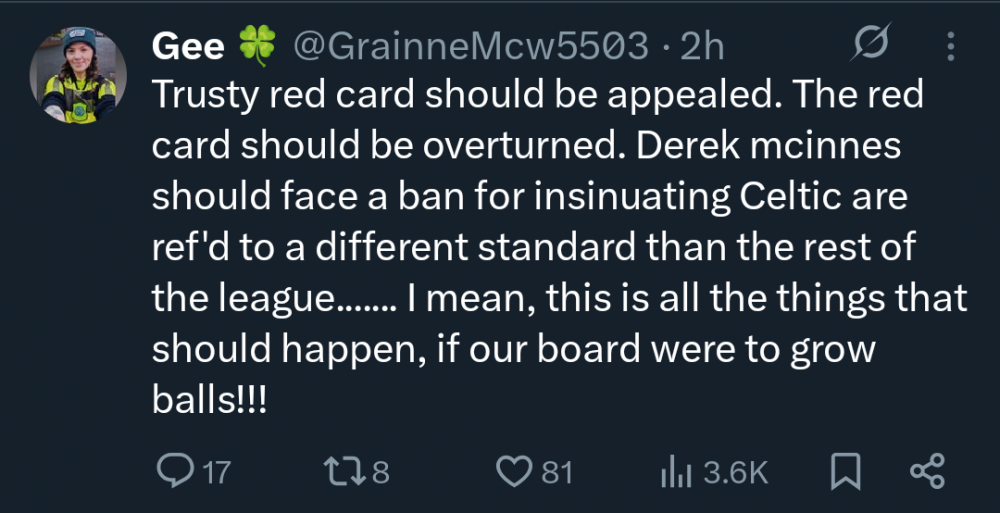 Locky Posted January 18 Posted January 18 Eek. This is going to have to be another battle. Celtic need the win, but our front line might find a bit more space and joy than in recent weeks. We're going to have to just try and grind it out and hope we hit them on the break. Oh, and try and keep 11 men on the park. My heart says a very valiant 1-1 draw, to march well into February firmly top of the league. My head says 2-0 Celtic.
