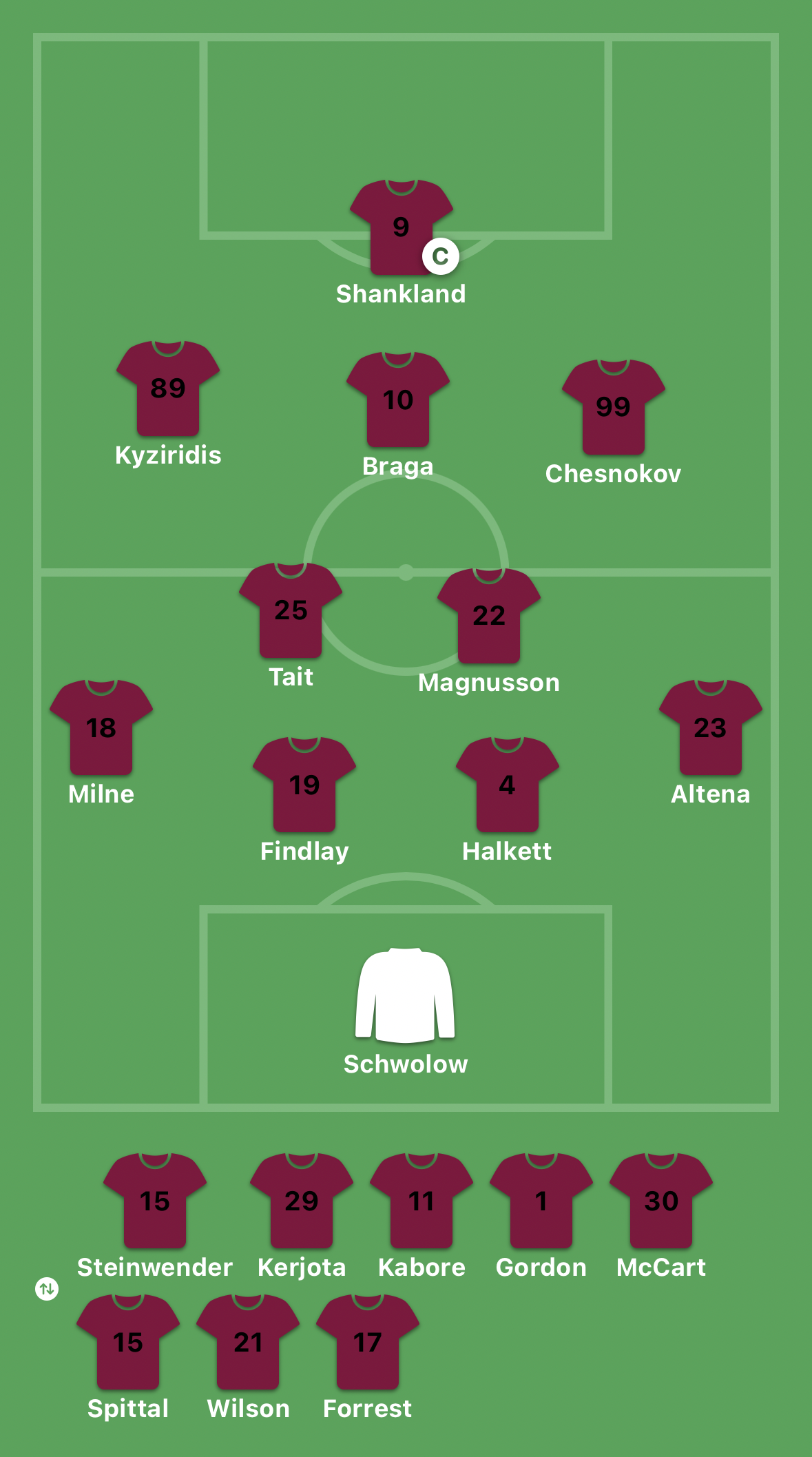 AndrewB Posted January 18 Posted January 18 Predicted team.... Schwolow Steinwender Halkett Findlay McCart Milne Magnusson Spittal Kyziridis Shankland Braga There isn't massive scope to change it; Altena, Chesnokov , Kabore, Kent probably the only other contenders for a start. Maybe Gordon (unlikely), maybe Forrest (doubt it).