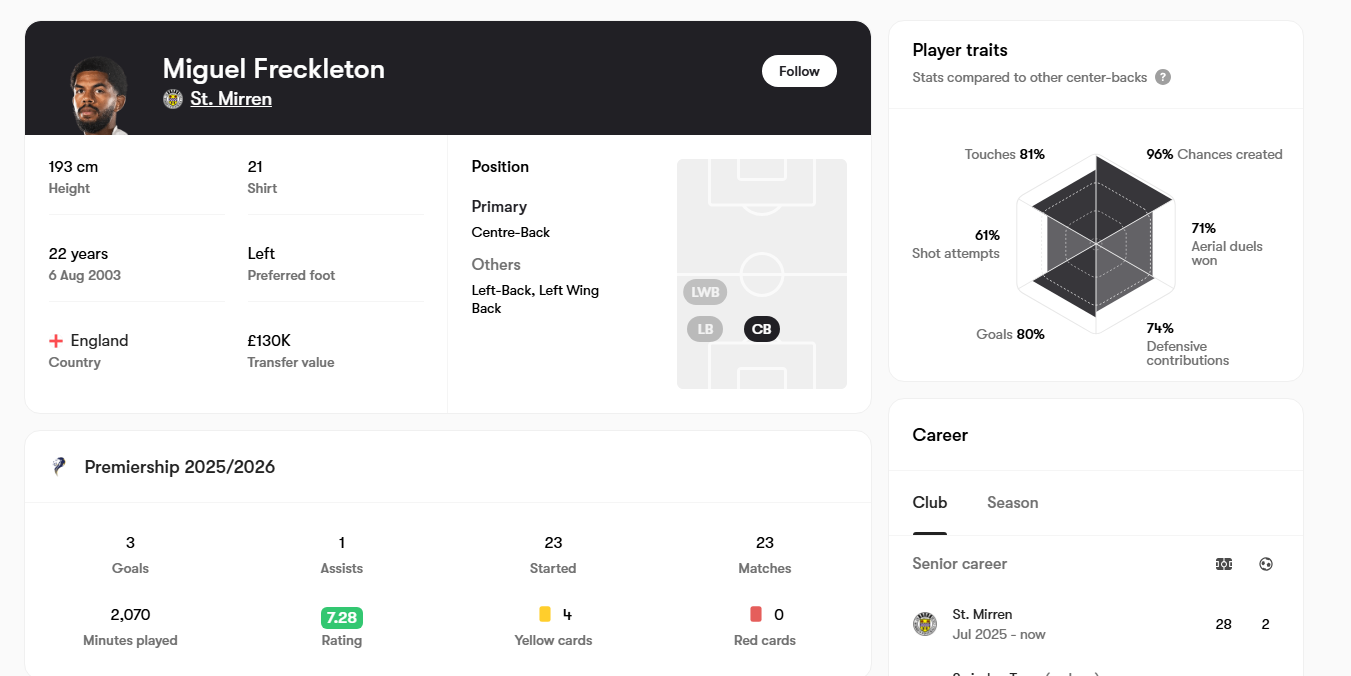 OTT Posted February 8 Posted February 8 On 04/02/2026 at 02:58, davie1980 said: Anyone else been impressed with Miguel Freckleton? He's scored 3 goals this season, won them 3 points today and scored against us in the 2-2 and against Hibs in a draw. So the lad has basically won the Hammer chuckers 5 of their 23 points with goals alone. He's 6'4", 22 years old and fairly mobile and just on the eye test I've been impressed with him each time I've seen him and I can't say that of many of their players Decided to back that up by looking at the data and Fotmob paints a good picture. Looks to have fairly good defensive stats but brings a lot more to the table in creative and attacking sense for a really bang average St Mirren team (they got the result today, but my god they are eye bleedingly awful to watch.) Yeah massively. Although he's another leftie. Annoyingly we need a good RCB back up for Halks. Freckleton at St Mirren or Graham at Utd would both be really good left sided options. On the flip side, maybe we need to look at improvements on Findlay anyway, and if they can come in and push him then that wouldn't be a bad outcome either.