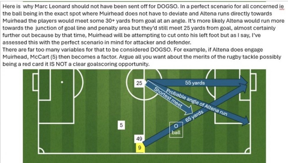 OTT Posted Wednesday at 16:54 Posted Wednesday at 16:54 8 minutes ago, fatjambo said: For me it's a red card,no attempt to play the ball,take one for the team and get on with it. The rationale behind the red card is really important though, if its DOGSO, are we really saying you can be denying an obvious goal scoring opportunity THAT far from goal? Remember, this builds precedent.. The volume of work Muirhead needs to do is huge and then, he needs to actually hold his nerve if he's even fast enough to outpace Altena who is racing back and already over the halfway line when the foul finishes, whilst controlling a ball (whereas all Altena needs to do is bomb back). In the below video clip, Darrell Currie mentioned about speaking to a top tier (champions league standard) ref who said around DOGSO, that the criteria around it being obvious is that they have a more than 50% chance of scoring. Muirhead has maybe a 10% chance if that, assuming everything goes his way. Altena is bearing down on him, Big Alex will charge out of his goal to close down the angle, Leonard is hot on his heels (assuming he doesn't foul), and then there is the reality that Muirhead needs to take a heavy touch to maintain his speed, does he **** it up and hit it too close to Alex in goals? Probably.. Christ, our players get more wrong that right, so the idea of a Livingston forward perfectly executing a breakaway attack with a huge amount of work to do himself, and all that time to overthink everything... its laughable to call that DOGSO IMO. Really good debate about it here which highlights a lot of the concerns about how ridiculous it is to be sending someone off in these circumstances; Willie Collum has completely ****ed up the interpretation of DOGSO and is making our refs look like even more rank amatuers. Even Hutton doesn't think you're getting sent off in the Premier league for that... He needs to be removed from post ASAP. No preserving his dignity, actually sacked and someone credible from England brought in. Sick of the West Coast musical chairs around who gets to head up the refs...